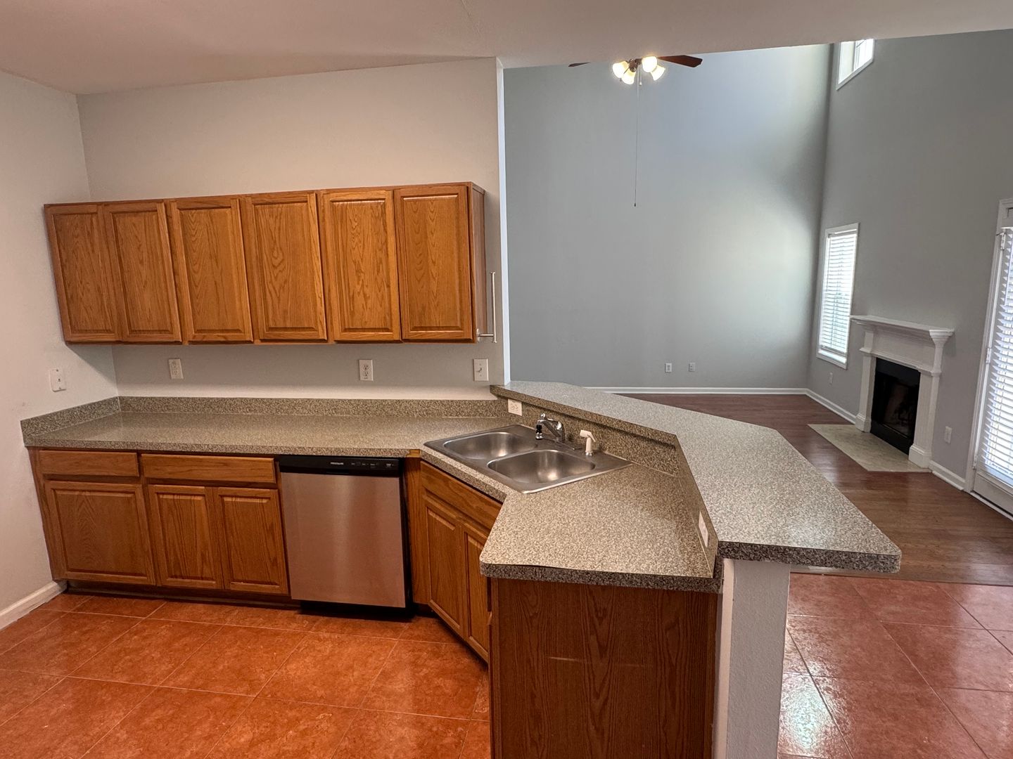 At the heart of the home is the open kitchen—fully equipped with essential appliances and thoughtfully designed for both functionality and connection. Whether you're enjoying a casual meal in the eat-in kitchen or gathering around the breakfast bar, you’ll stay connected to the adjacent living room. Here, a cozy fireplace and dramatic high ceilings create a truly captivating space for relaxing or entertaining.