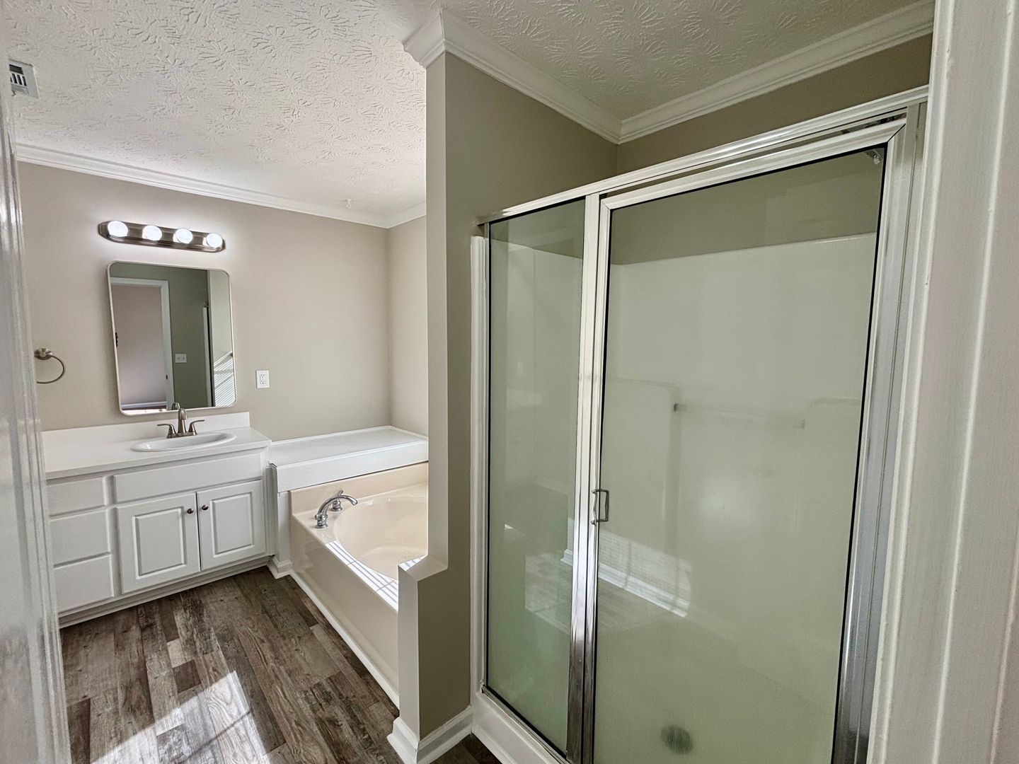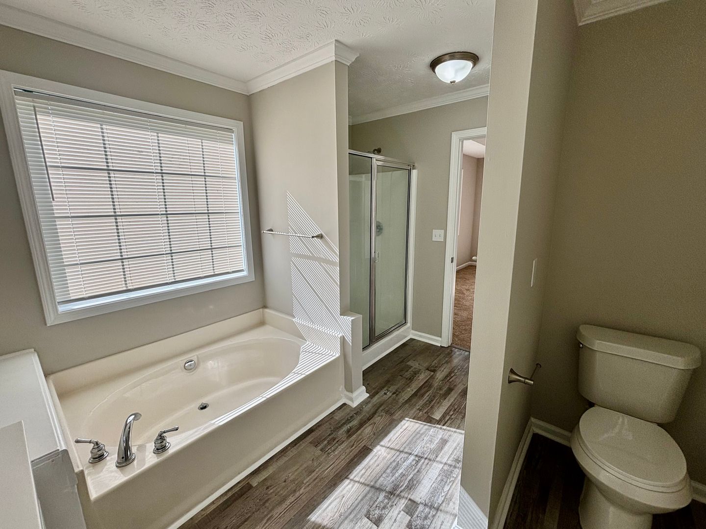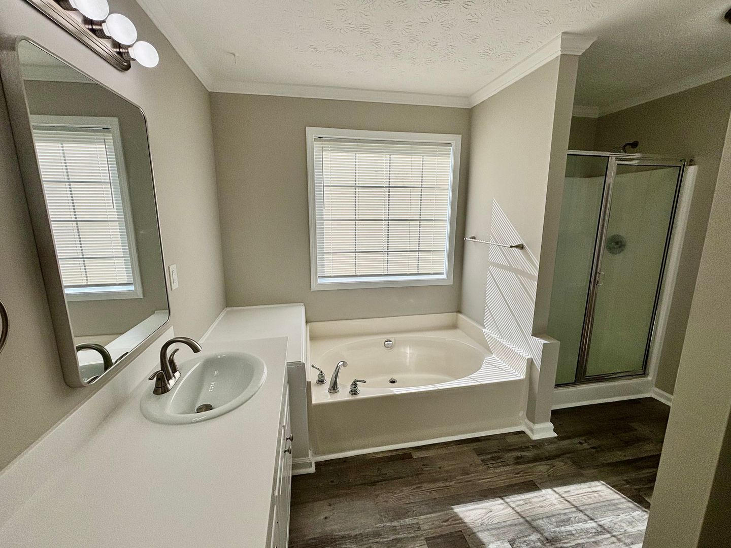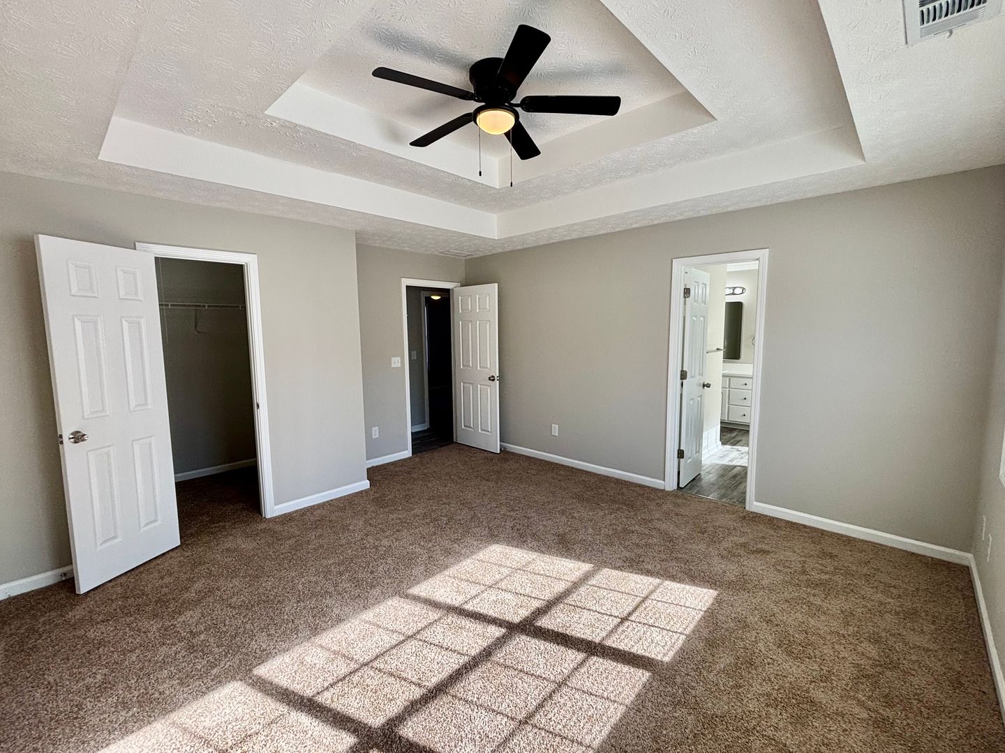 The primary suite offers a double trey ceiling, generous layout, and an ensuite bath complete with double vanities, a relaxing garden tub, and a separate shower.