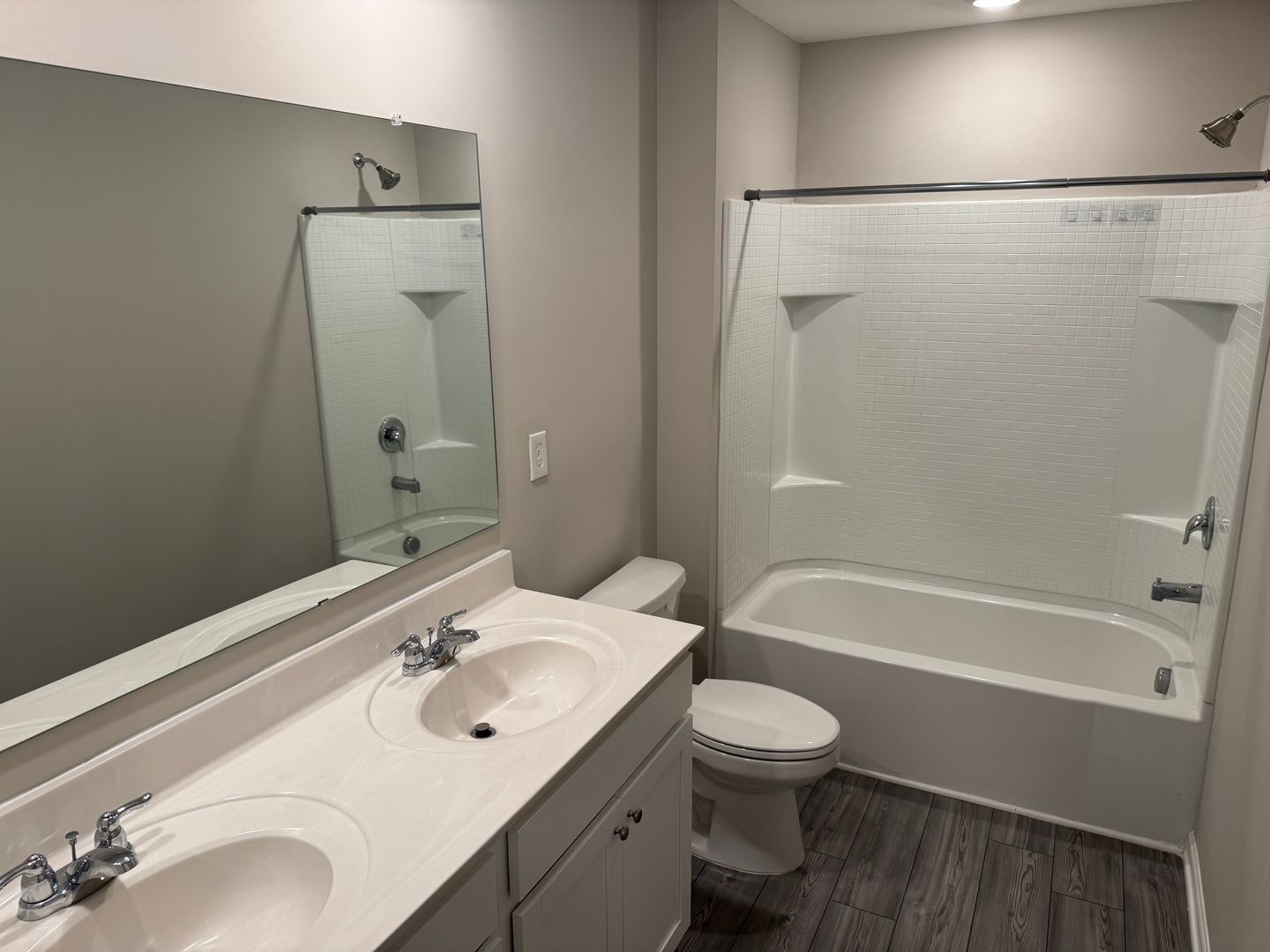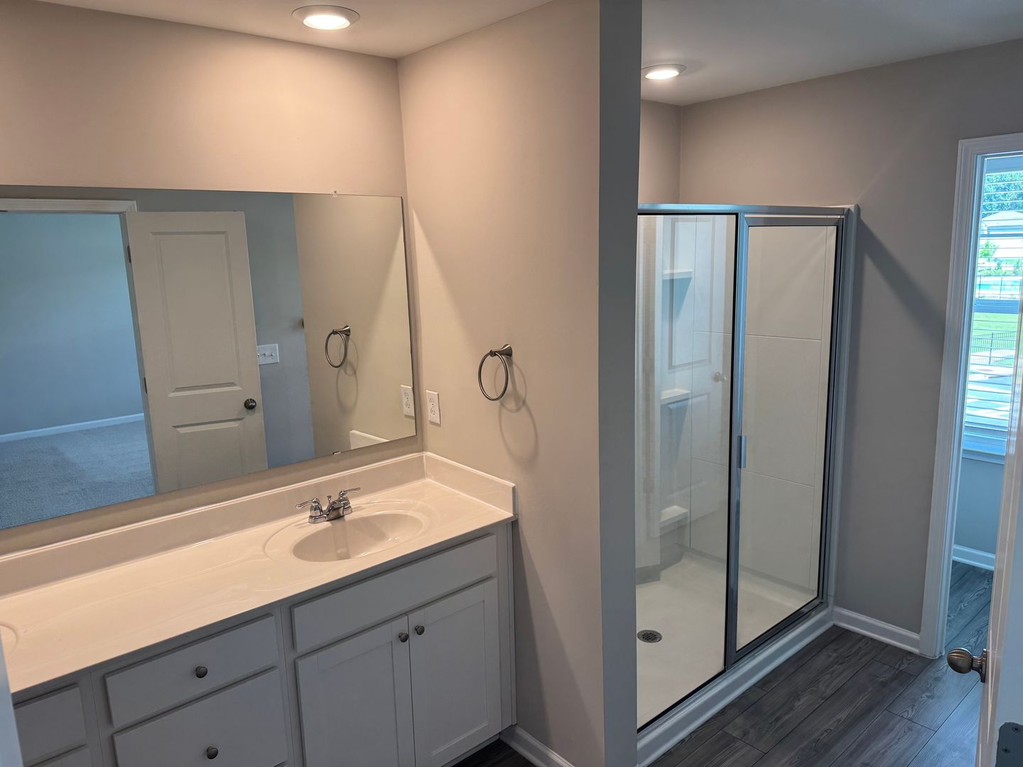 The modern kitchen opens seamlessly to the living room and is equipped with sleek stainless steel appliances, ample cabinet space, and a convenient layout for everyday use. Upstairs, the spacious primary suite offers a private retreat with a large walk-in closet, double vanities, and a luxurious oversized shower. The guest bathroom also includes double vanities for added convenience.