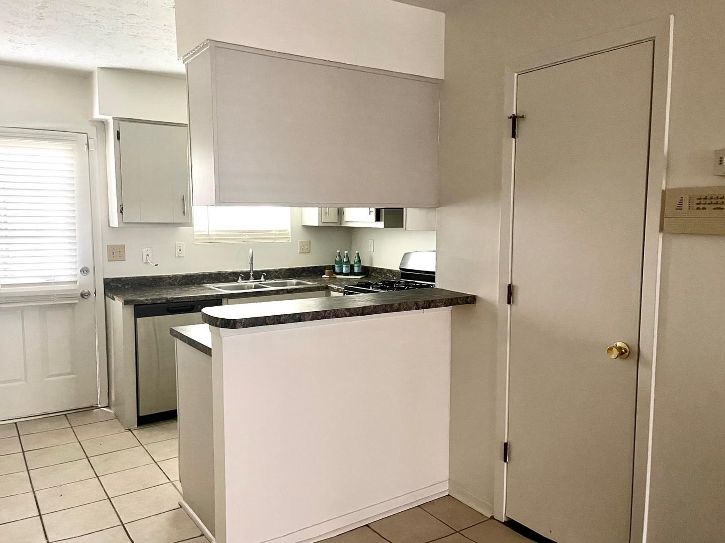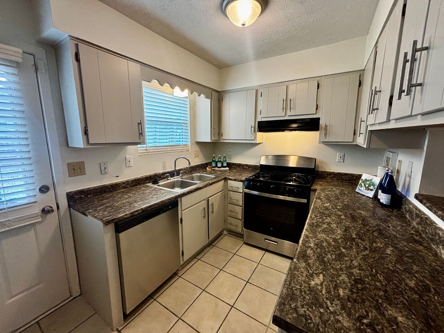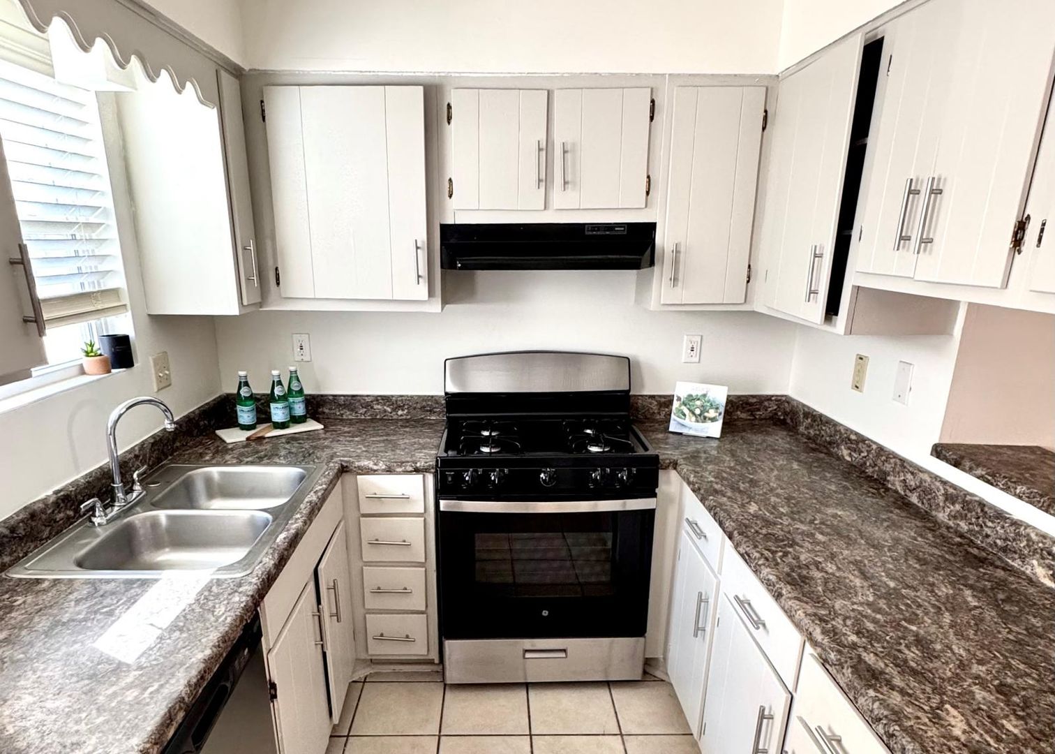 The eat-in kitchen offers brand-new stainless steel appliances, including a gas range, dishwasher, and refrigerator, and flows seamlessly into the main living space. A convenient laundry closet in the hallway adds everyday ease.